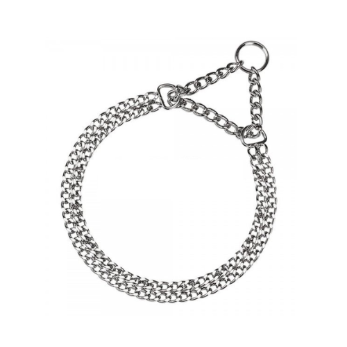 Metāla daļēji žņaudzoša kakla siksna suņiem. Izgatavota no hromēta tērauda, ​​šī daļēji žņaugšanas tipa suņu kakla siksna ir ideāli piemērota suņa apmācībai. Tās metāla sieta konstrukcija ir izturīga un ilgmūžīga, komplektā ar ērtu pavadas stiprinājuma gredzenu. Metāla suņu kakla siksnas ir pieejamas sešos dažādos izmēros, piemērotas visu izmēru mājdzīvniekiem.