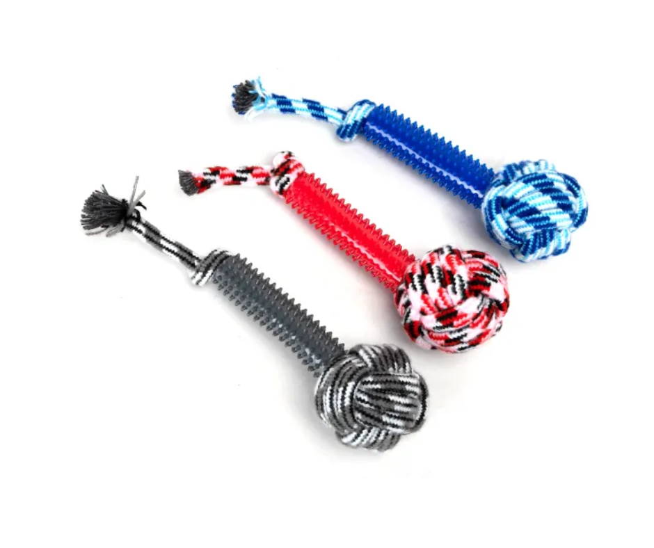 Gumijas rotaļlieta suņiem ar kokvilnas virvi un bumbu, kas palīdz tīrīt zobus un uzturēt mutes dobuma higiēnu.